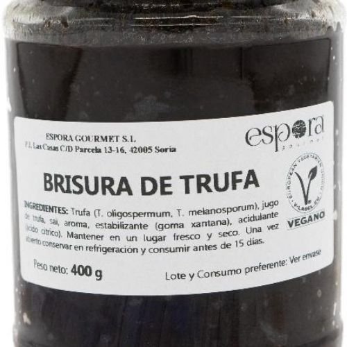 La brisura de trufa de Espora Gourmet ofrece trozos de trufa en su propio jugo para trufar al instante pastas, huevos, patatas, risottos, mayonesas o mantequillas. Su formato permite dosificar con precisión y repartir el aroma de forma homogénea.